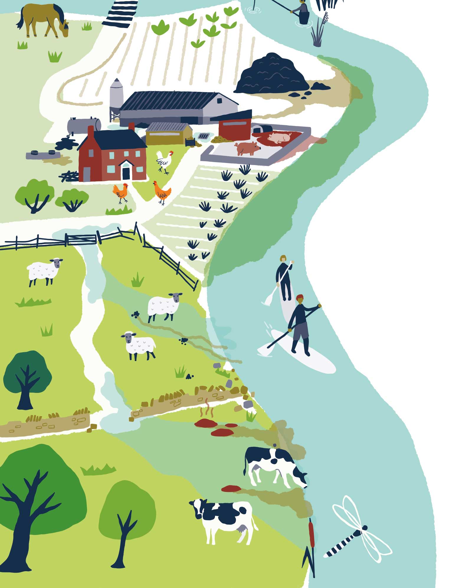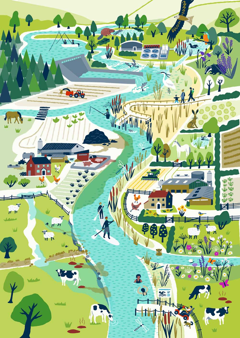 The right hand side of the river shows how things could be if we take a more holistic, catchment-wide approach, working in partnership.